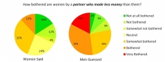 Surprised? You are not alone. We also asked men to guess how women responded and we asked women to guess how men responded. We found that both men and women statistically significantly overestimated how bothered the other gender would be by non-traditional gender-role incomes. The differences were drastic, with 52% of men and 81% of women believing that the opposite gender would be bothered/ very bothered by non-traditional gender-role incomes (see pie charts, click to enlarge).